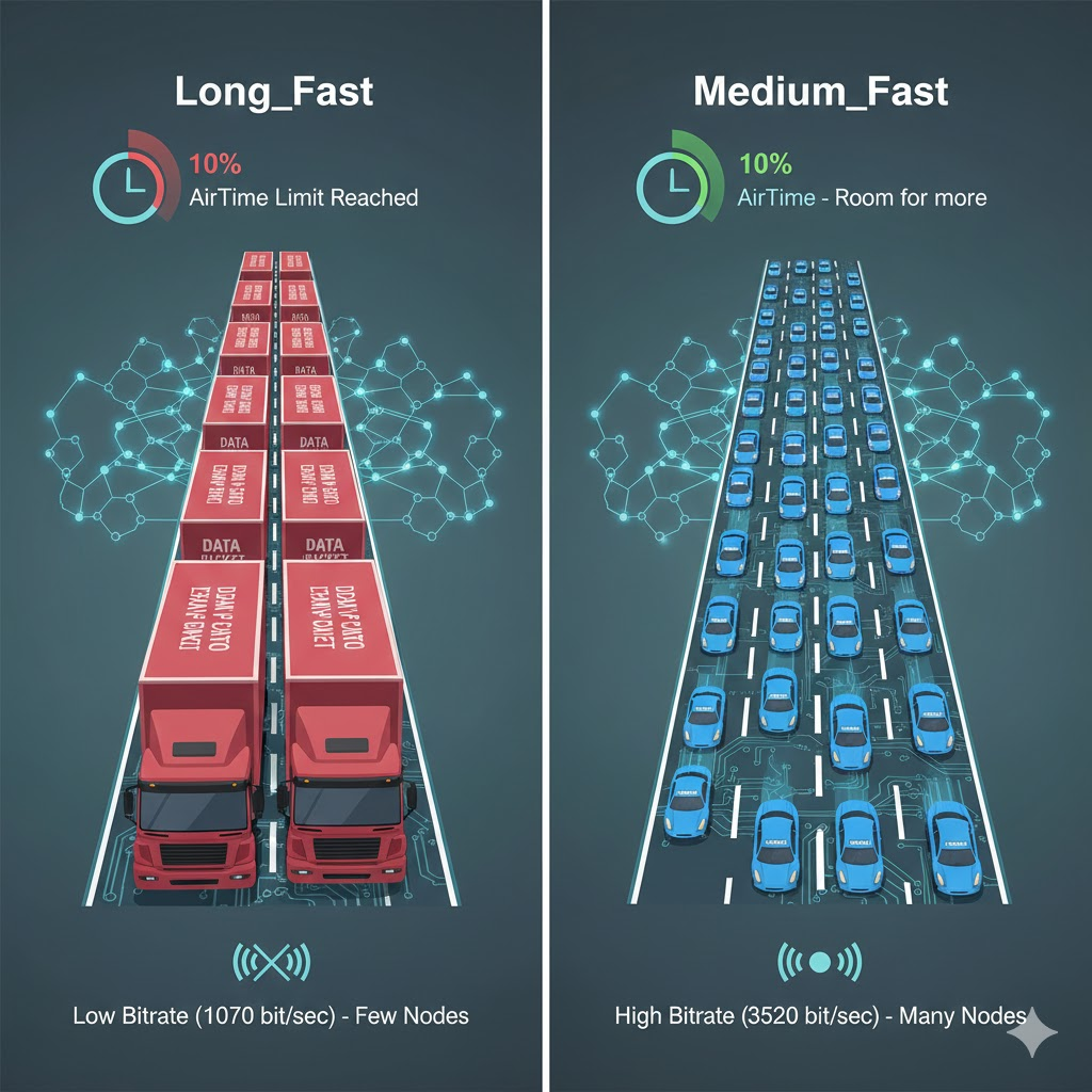 Abbiamo fatto delle prove e il risultato è che al crescere del numero dei nodi, il Long_Fast satura rapidamente l’AirTime concesso (10% su base oraria, ossia si può trasmettere solamente per 6 minuti complessivi ogni ora, e non è molto) perchè può trasmettere pochi bit/sec (1070 bit/sec)