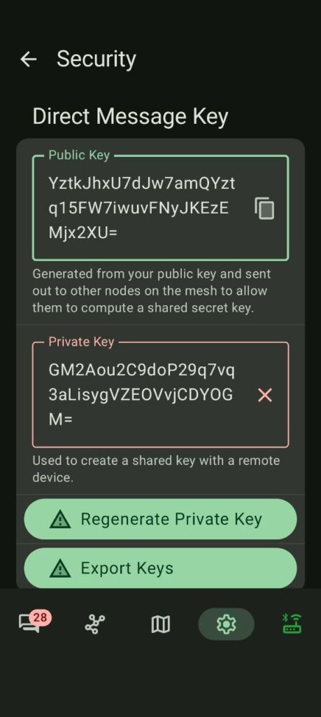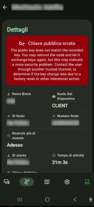 Perché identificano univocamente il tuo nodo nella rete. Se fai un reset senza salvarle, il dispositivo ne genera di nuove e gli altri nodi non ti riconoscono più : il tuo nodo appare evidenziato da una chiave rossa, viene considerato non affidabile e i messaggi non vengono più inoltrati.