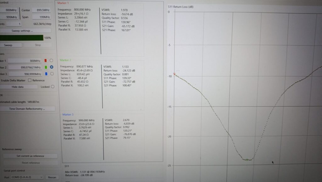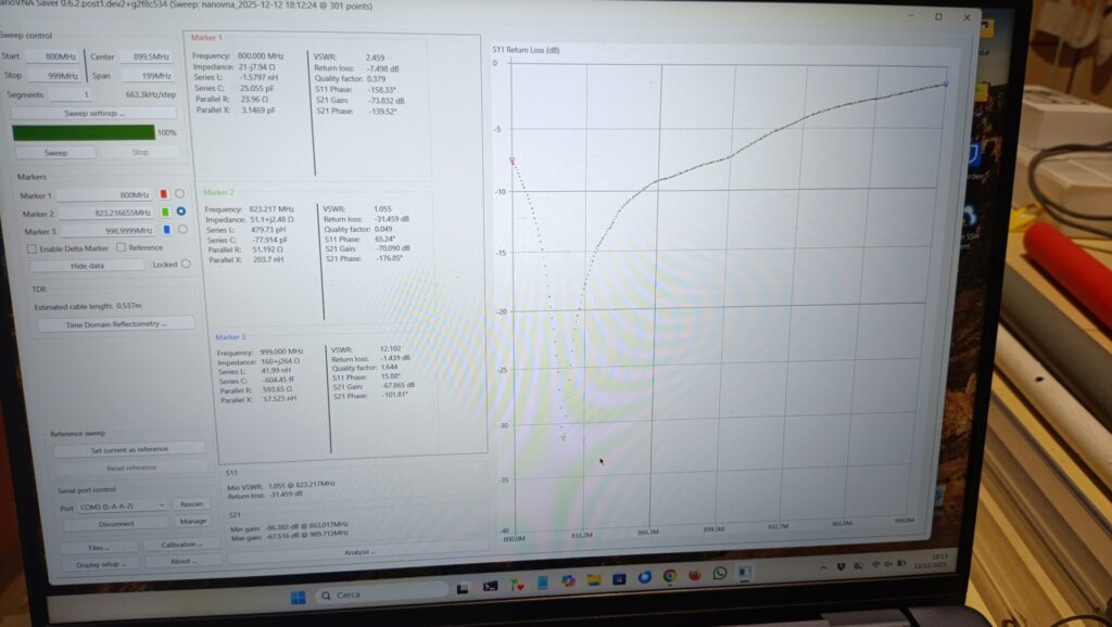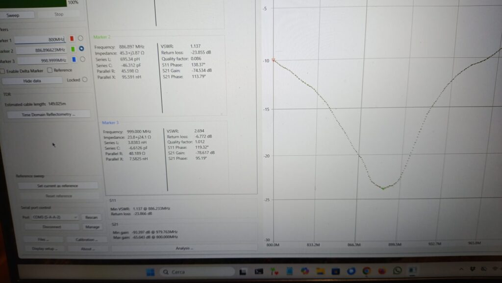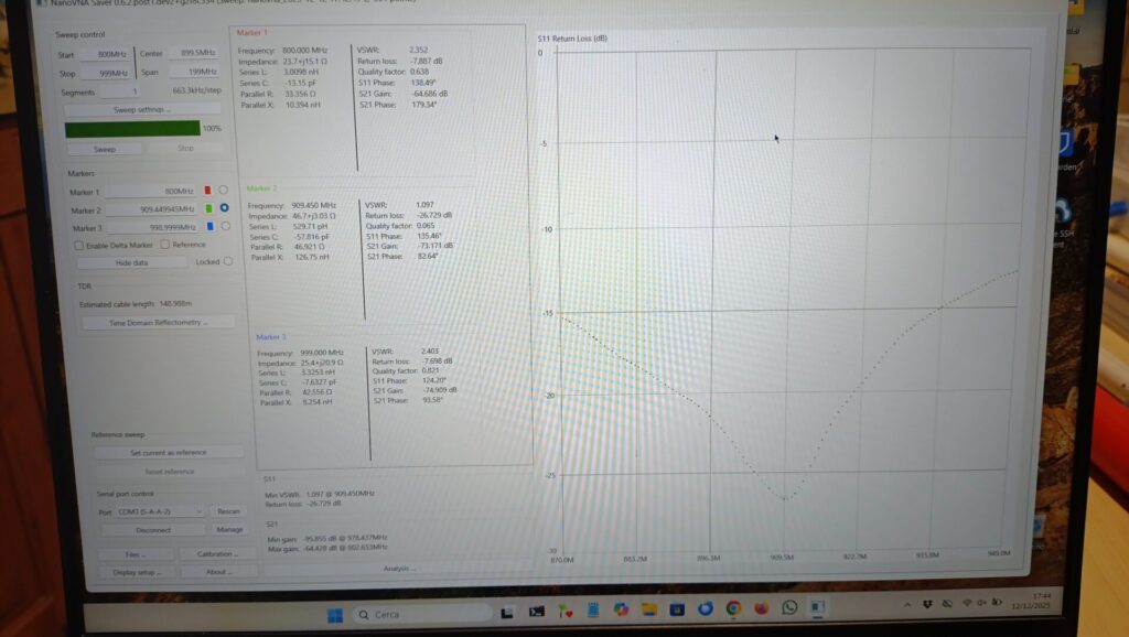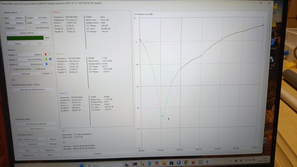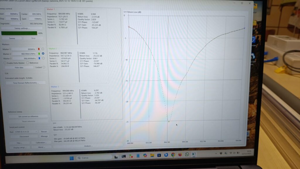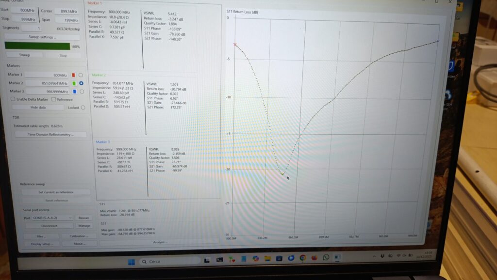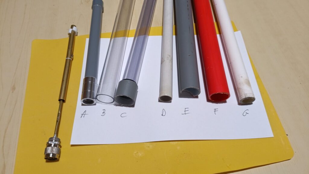 I test sono stati condotti con il nanoVNA SAA-2N su connettore N. Ho preso nota delle frequenze di risonanza delle due antenne senza alcun radome e poi successivamente con i sette radome montati. Sarà il caso di precisare che quando si parla di frequenza di risonanza si intende la frequenza alla quale l’antenna ha una impedenza puramente resistiva, senza reattanze residue. Questa resistenza non necessariamente coincide con 50 ohm, ma nel nostro caso non se ne è mai discostata in maniera eclatante.