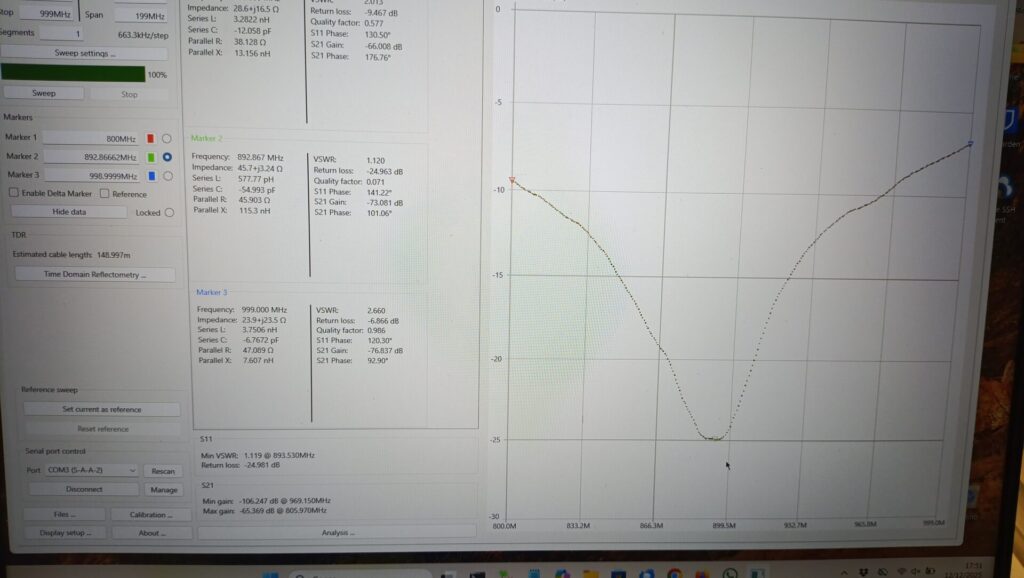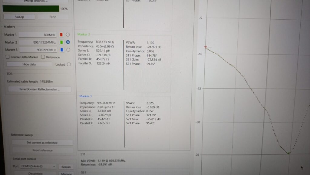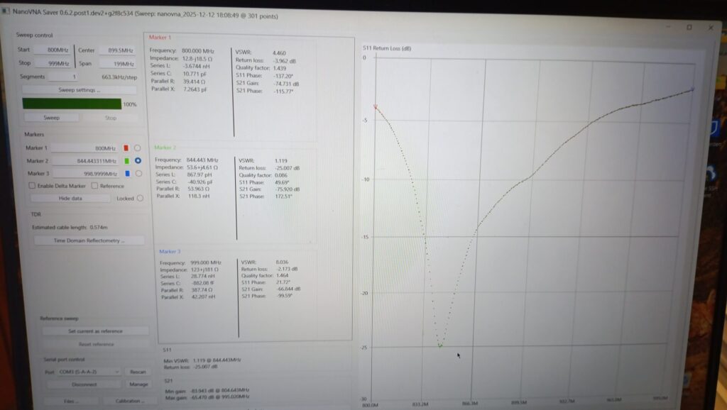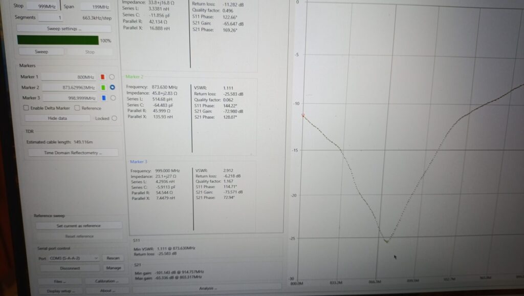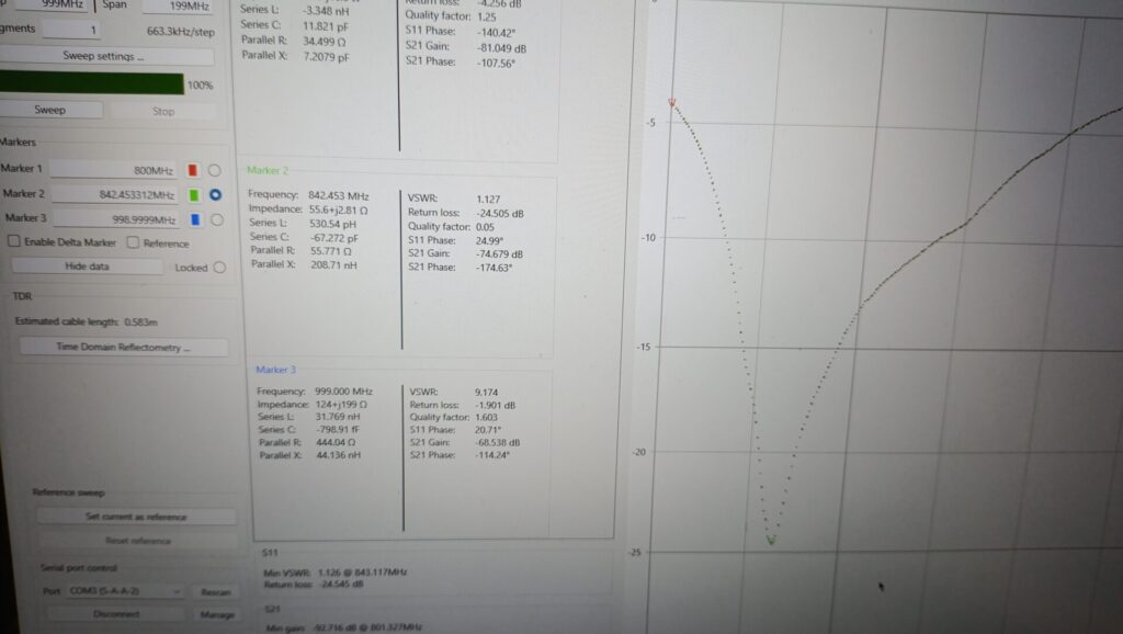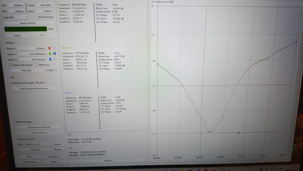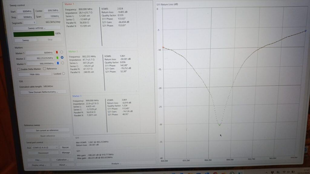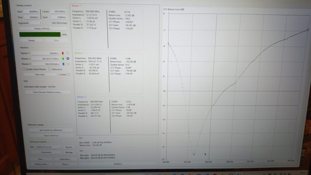 I test sono stati condotti con il nanoVNA SAA-2N su connettore N. Ho preso nota delle frequenze di risonanza delle due antenne senza alcun radome e poi successivamente con i sette radome montati. Sarà il caso di precisare che quando si parla di frequenza di risonanza si intende la frequenza alla quale l’antenna ha una impedenza puramente resistiva, senza reattanze residue. Questa resistenza non necessariamente coincide con 50 ohm, ma nel nostro caso non se ne è mai discostata in maniera eclatante.