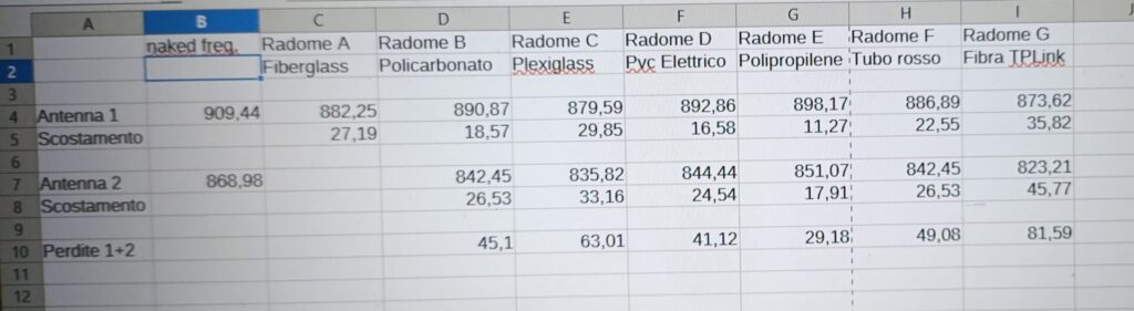 Nel foglio sono calcolati gli scostamenti nelle frequenze di risonanza derivanti dall’applicazione dei vari radome. A formare una sorta di classifica, è evidenziata anche la somma per le due antenne. E’ palese che la collineare, essendo lunga più del doppio, soffre maggiormente per l’interposizione dei radome.