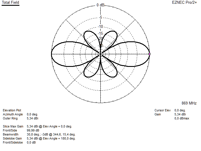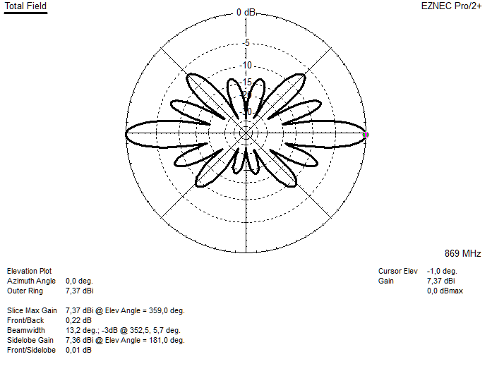 Ed ecco il corrispondente diagramma di irradiazione. Questa antenna alla frequenza di 869 MHz sarebbe alta più di un metro solo per gli elementi, ma bisognerà pur aggiungere il connettore e un minimo di spazio per la staffa. Diciamo quindi attorno a 120 cm.