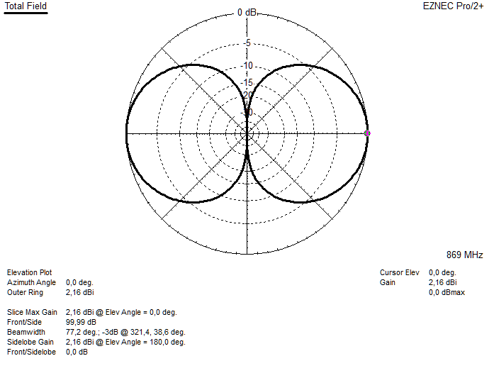 Il guadagno di un dipolo verticale per la frequenza di 869 MHz, 3.5 metri sopra il livello del suolo, è di circa 7.4 dBi ad un angolo di 1.5 gradi. A diversi gradi di elevazione corrispondono guadagni differenti.
