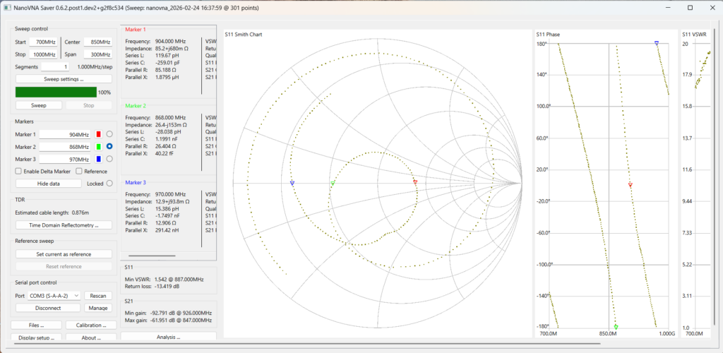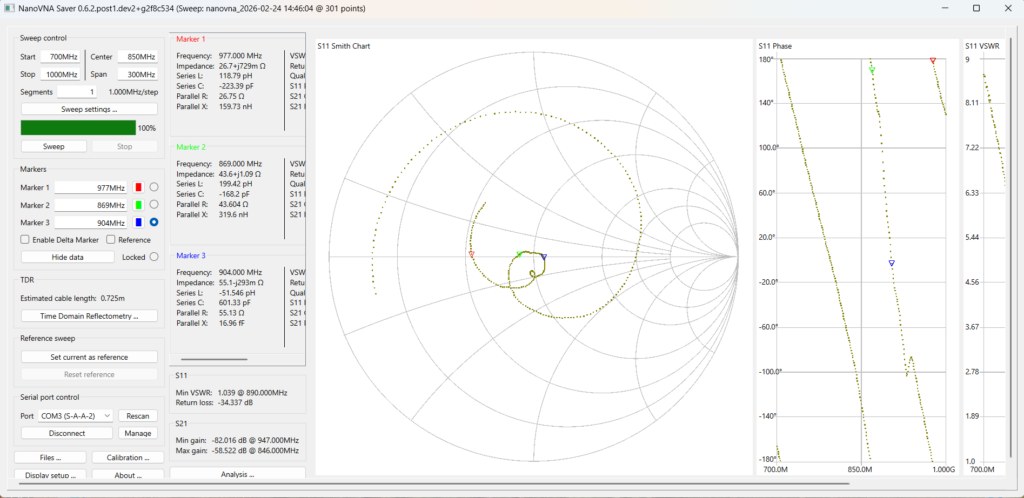Peraltro lavorare con la fase usando il nanoVNA sembra dannatamente difficile, perché nella zona di inversione della fase i numeri cambiano troppo rapidamente per essere utilizzabili.