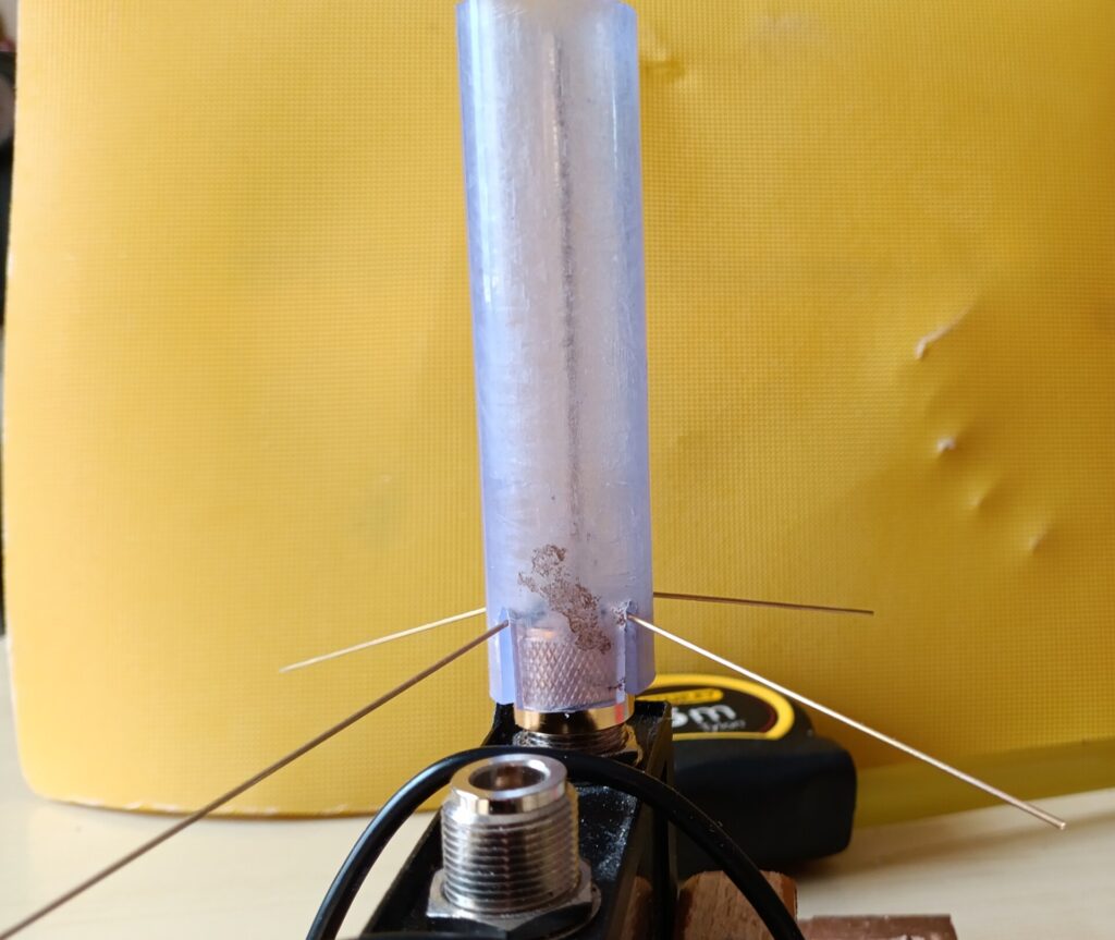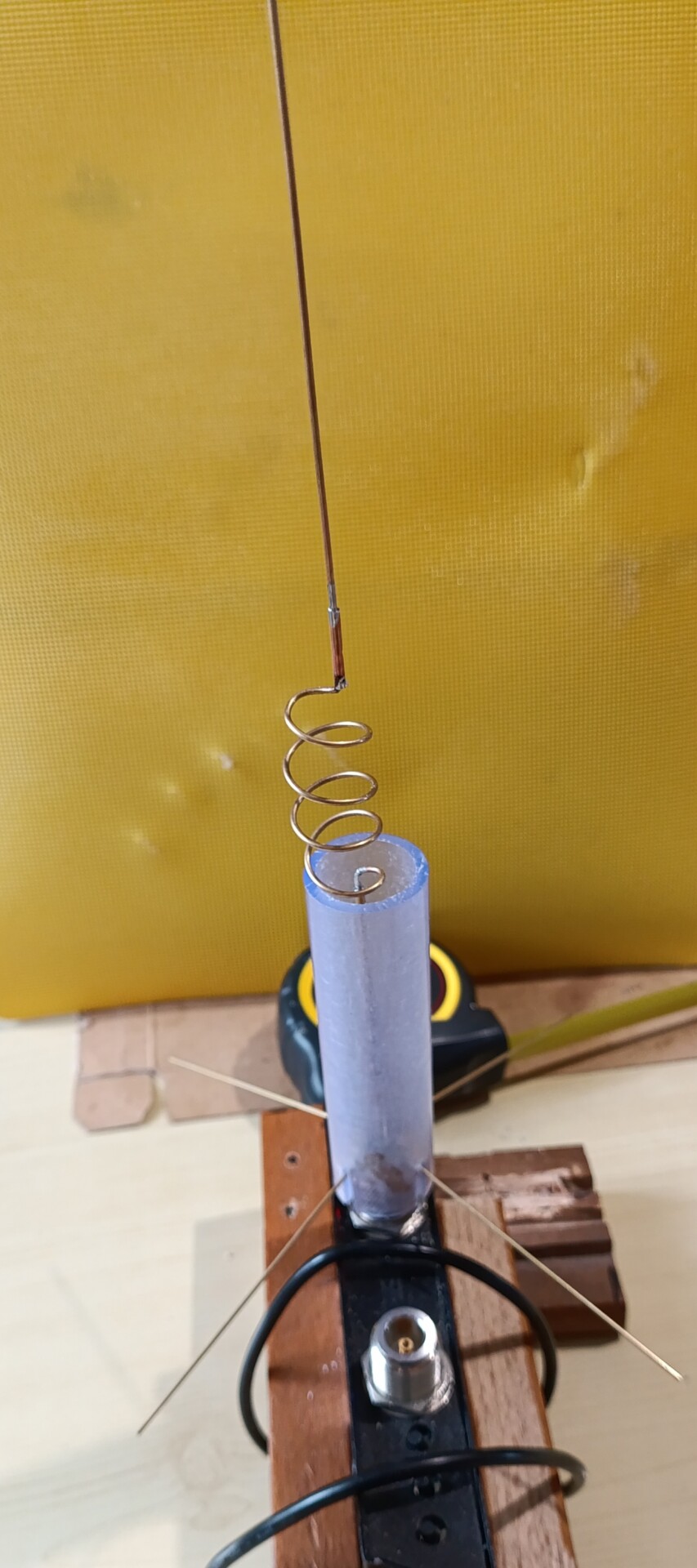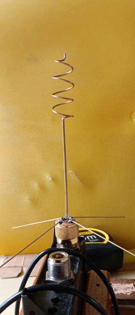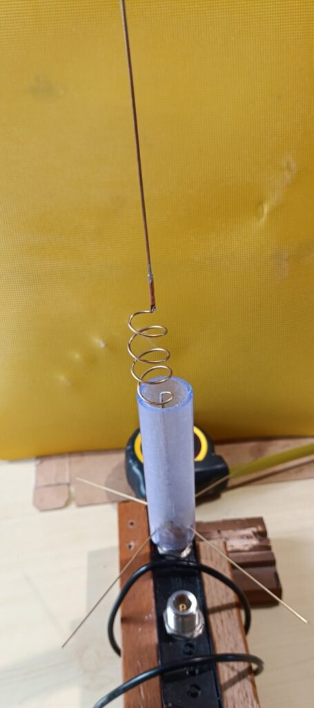 Allora, empiricamente, la strada più corta potrebbe consistere nel preparare una base, diciamo una GP, in perfetta risonanza e poi saldarci sopra la bobina. Si noti che in questo caso il diametro della bobina è stato scelto in modo di adattarsi al radome. La bobina è diametro 16mm e, come vedrete, conterà circa 4 spire spaziate da circa 12 mm. E’ un compromesso, in realtà un diametro ottimizzato dovrebbe essere minore e il numero di spire maggiore, e maggiore anche la dimensione verticale della bobina. Ma bisogna che l’antenna stia ragionevolmente ferma dentro al radome.