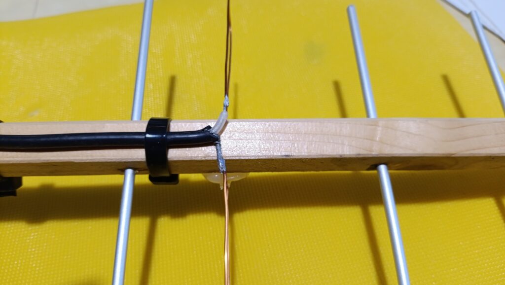 Il guadagno, tuttavia, sembra addirittura cresciuto. Adesso possiamo banalmente saldare i capi del coassiale al folded. L’antenna, montata per il micro aggiustamento finale, si presenterà in questo modo.